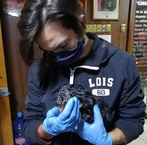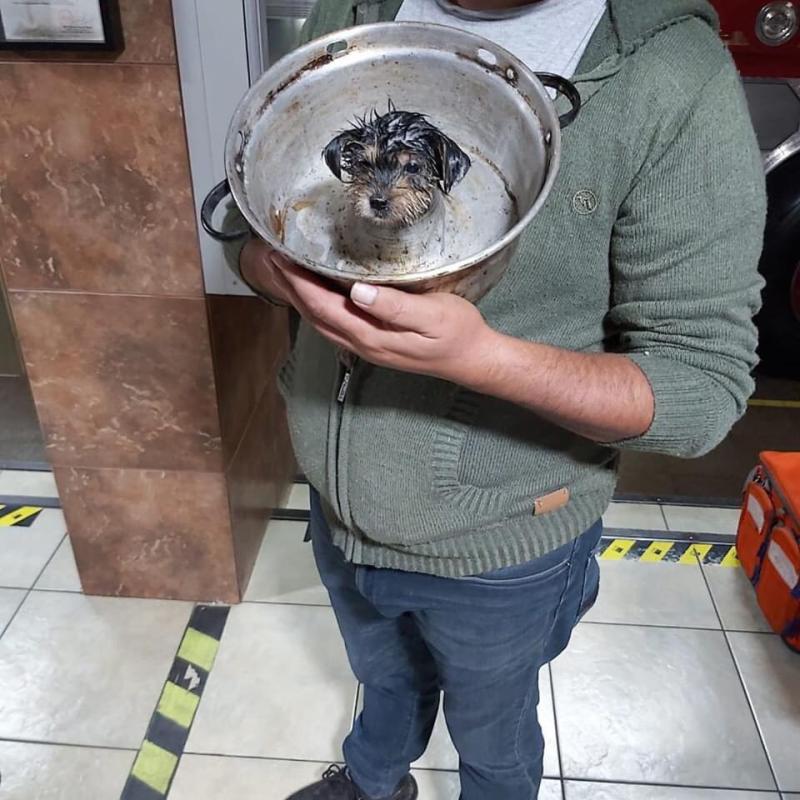 Personal del cuerpo de Bomberos Metropolitano Sur estuvo a cargo del procedimiento para rescatar a este perrito, el cual fue llevado a su cuartel por sus dueños, preocupados por la vida de la tierna mascota.