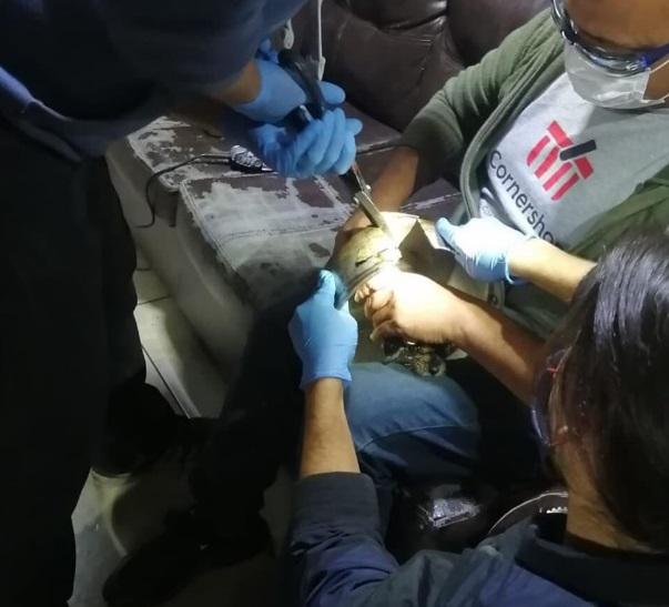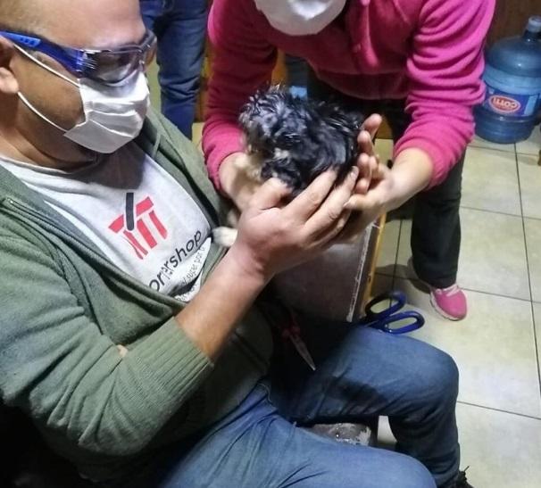 “Ellos (la familia) nos tocaron la puerta y llegaron con este cachorro. Estaban muy angustiados, pero pudimos rescatarlo sin daño alguno”, dijo Carrasco, quien agregó que “según nos dijo la dueña, el animal estaba jugando y metió la cabeza ahí, pero con una tijera corta latas se le dio solución”.