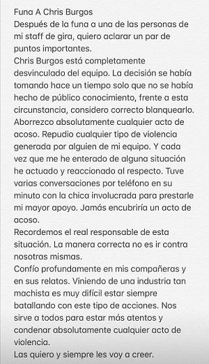 Finalmente, la artista concluyó su mensaje con, "confío profundamente en mis compañeras y sus relatos. Viniendo de una industria tan machista es muy difícil estar siempre batallando con este tipo de acciones (...) Las quiero y siempre les voy a creer".