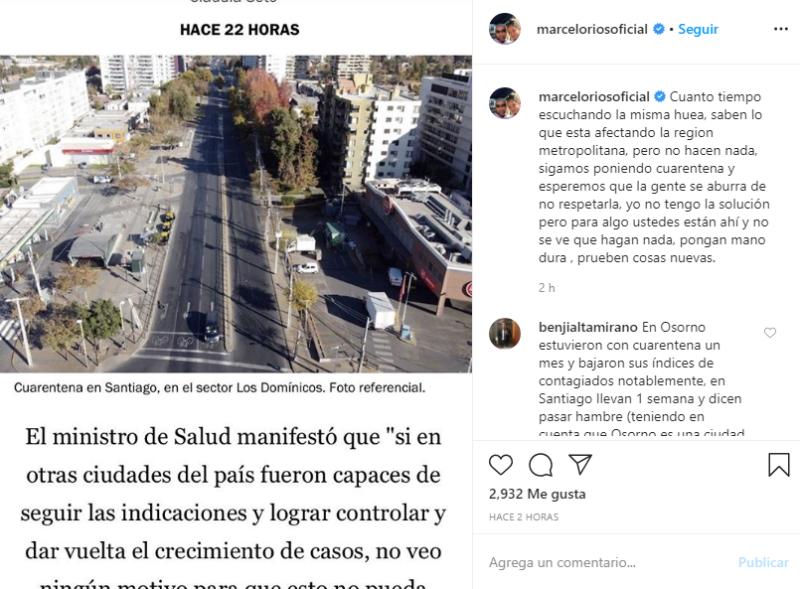 Como en oportunidades anteriores, el ex tenista utilizó su cuenta oficial de Instagram (@marceloriosoficial) para cuestionar a las autoridades por la forma en que se ha enfrentado la propagación del coronavirus en Chile, donde actualmente hay cuarentena en el Gran Santiago y tres comunas del resto del país.