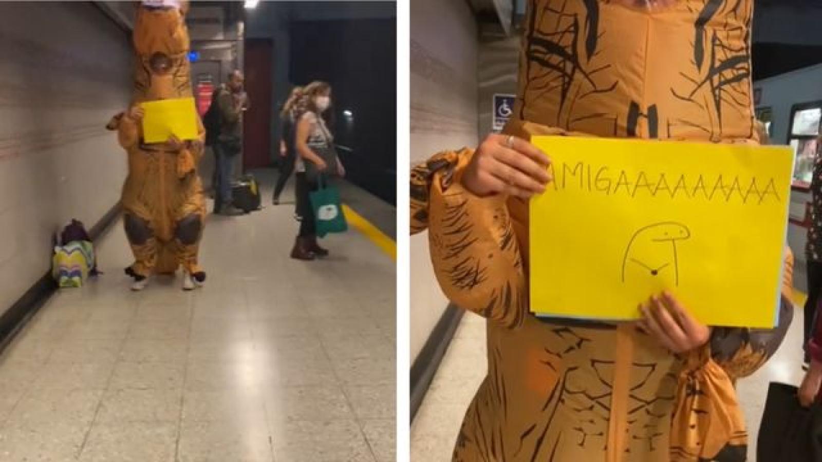 Cumplió 30 años y su amiga la sorprendió portando cartelitos vestida de dinosaurio en el Metro
