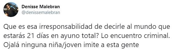 “Que es esa irresponsabilidad de decirle al mundo que estarás 21 días en ayuno total”, escribió la cantante de la banda “Saiko”, quien agregó que “lo encuentro criminal. Ojalá ninguna niña/joven imite a esta gente”.