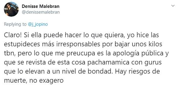 Malebrán profundizó en su cuestionamiento. “Ella puede hacer lo que quiera, yo hice las estupideces más irresponsables por bajar unos kilos tbn, pero lo que me preucupa es la apología pública y que se revista de esta cosa pachamamica con gurus que lo elevan a un nivel de bondad. Hay riesgos de muerte, no exagero”, afirmó.