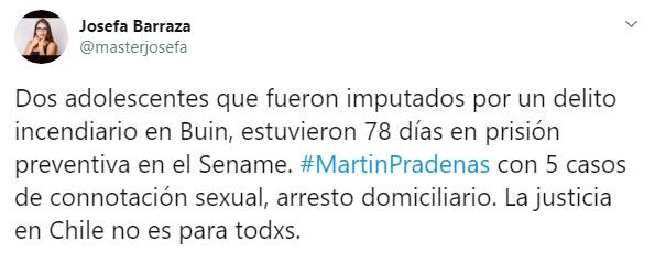 “Dos adolescentes que fueron imputados por un delito incendiario en Buin, estuvieron 78 días en prisión preventiva en el Sename. #MartinPradenas con 5 casos de connotación sexual, arresto domiciliario”, afirmó Barraza, quien agregó que “la justicia en Chile no es para todos”.