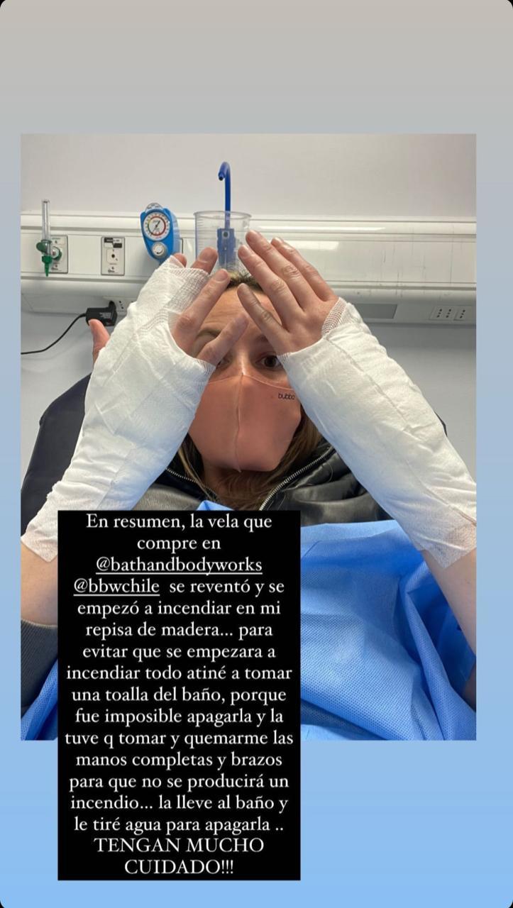 “En resumen, la vela que compre…se reventó y se empezó a incendiar en mi repisa de madera….para evitar que se empezara a incendiar todo atiné a tomar una tolalla del baño, porque fue imposible apagarla y la tuve que tomar y quemarme las manos completas y brazos para que no se produjera un incendio…la llevé al baño y le tiré agua para apagarla ¡Tengan mucho cuidado!”, escribió en una de las fotografías compartidas, donde aparece con sus dos manos vendadas.