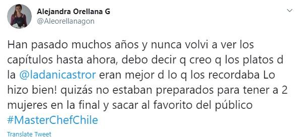 “Han pasado muchos años y nunca volví a ver los capítulos hasta ahora, debo decir q creo q los platos de la @ladanicastror eran mejor d lo q los recordaba Lo hizo bien! quizás no estaban preparados para tener a 2 mujeres en la final y sacar al favorito del público”, escribió Alejandra en su cuenta personal, aludiendo a la ganadora del programa y quien quedó segundo, Ignacio Román.
