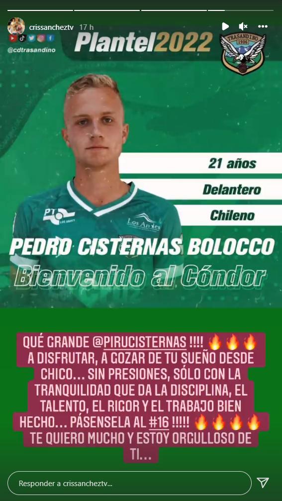 Entonces, ante el logro de Pedro, Cristián Sánchez manifestó en sus historias un emotivo mensaje: "A gozar de tu sueño desde chico, sin presiones, solo con la tranquilidad que da la disciplina, el talento, el rigor y el trabajo bien hecho. Pásensela al 16. Te quiero mucho y estoy orgulloso de tí".