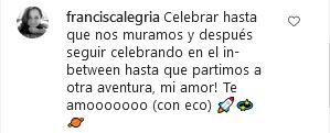 Alegría le respondió en el mismo post con, "celebrar hasta que nos muramos y después seguir celebrando en el in-between hasta que partimos a otra aventura, mi amor! Te amooooooo (con eco)".