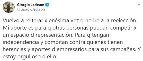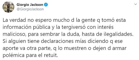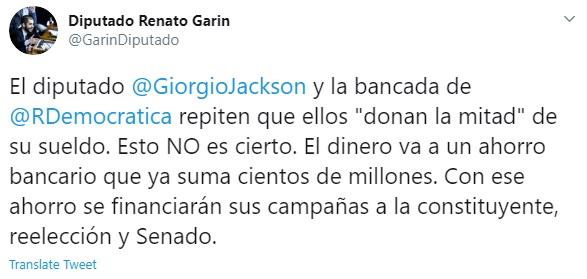 “El diputado Giorgio Jackson y la bancada de Revolución Democrática repiten que ellos "donan la mitad" de su sueldo. Esto NO es cierto. El dinero va a un ahorro bancario que ya suma cientos de millones. Con ese ahorro se financiarán sus campañas a la constituyente, reelección y Senado”, escribió Garín en su cuenta personal.