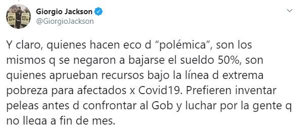 Asimismo, Giorgio Jackson indicó que quienes han tomado en serio esta controversia “son los mismos que se negaron a bajarse el sueldo 50%, son quienes aprueban recursos bajo la línea de extrema pobreza para afectados por Covid19. Prefieren inventar peleas antes de confrontar al Gobierno y luchar por la gente que no llega a fin de mes”.