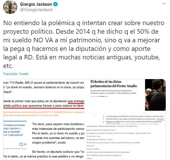 Los dichos del parlamentario desataron controversia en redes sociales, donde Jackson decidió responder en detalle. “No entiendo la polémica q intentan crear sobre nuestro proyecto político. Desde 2014 q he dicho q el 50% de mi sueldo NO VA a mi patrimonio, sino q va a mejorar la pega q hacemos en la diputación y como aporte legal a RD”, expresó el parlamentario.