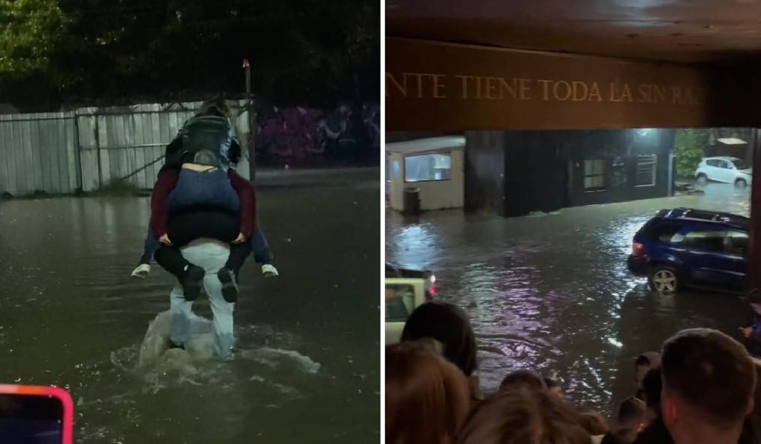 Un estacionamiento de una disco en el sur de Chile se inundó debido a las fuertes lluvias y dejó a jóvenes que habían ido a "carretear" sin otra opción que mojarse los pies para volver a casa.