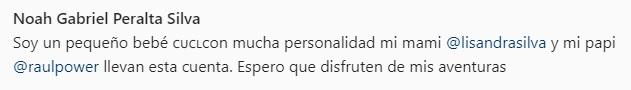 Casi 35 mil seguidores alcanza la cuenta de Noah Peralta Silva, primogénito de Lisandra Silva y Raúl Peralta. El 25 de diciembre se publicó la primera imagen del pequeño, quien tiene solamente meses de vida. “Soy un pequeño bebé con mucha personalidad”, dice la presentación del niño en esa plataforma digital.