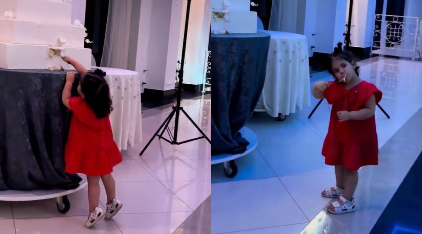 En el video se puede ver cómo la menor se pone en puntitas para agarrar con un tenedor un gran pedazo de torta, afirmándose de la mesa, superando todos sus límites.
