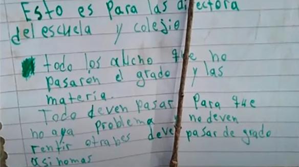“Esto es para la directora de la escuela y colejio (sic), todos los alucno (sic) que no pasaron de grado y las materias deben pasar para que no aya (sic) problema y no deben rendir otrabez (sic), deben pasar de grado así nomas (sic)”, rezaba la nota.
