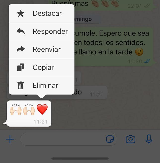 ¿Cómo utilizarla? Es sencillo: debes mantener seleccionado el mensaje, con lo cual surgirá un menú con las opciones de reenviar, responder, copiar, eliminar y también destacar. Al apretar esa alternativa, el texto elegido quedará marcado con una estrella.