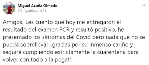 Miguel Acuña, integrante del Departamento de Prensa de Canal 13, dio positivo por COVID-19. El ex conductor del programa “3x3” reveló esta información a través de su cuenta oficial de Twitter (@miguelacuna13).