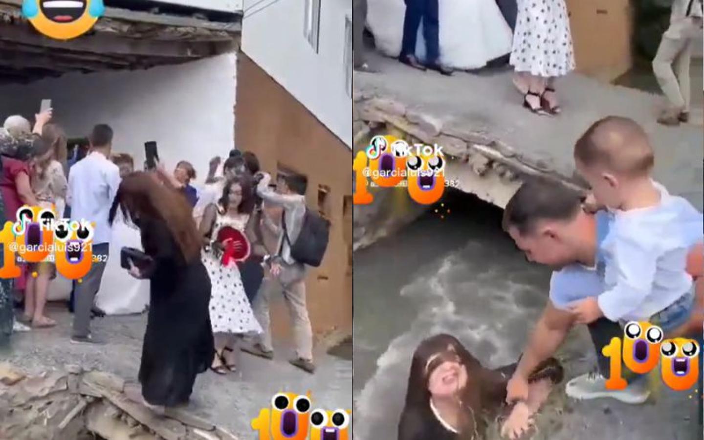 En las imágenes se puede ver cómo una mujer cae a un riachuelo que se encontraba justo en el lugar por donde estaban pasando los recién casados, una especie de mini puente. La invitada no se dio cuenta de que estaba parada justo en el borde del puentecito y resbaló hacia atrás sin la posibilidad de agarrarse de alguien, así que cayó directo al agua quedando toda empapada.