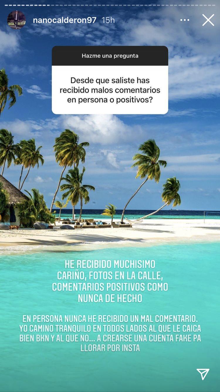 “He recibido muchísimo cariño, fotos en la calle, comentarios positivos como nunca de hecho”, aseguró. “En persona nunca he recibido un mal comentario, yo camino tranquilo en todos lados al que le caiga bien bkn y al que no… a crearse una cuenta fake pa llorar por insta”, agregó Calderón, dejando claro que no le afecta lo que se diga de él.