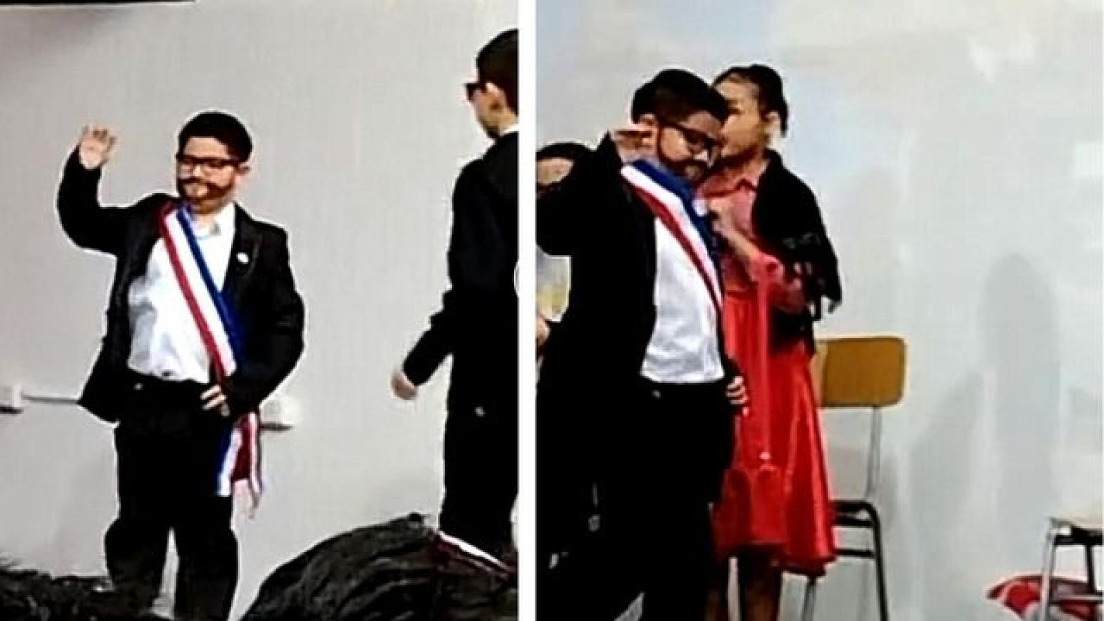Con banda presidencial, lentes e incluso una falsa barba, el pequeño subió al escenario sorprendiendo a los presentes ante el parecido entre el pequeño protagonista y el Presidente Boric.