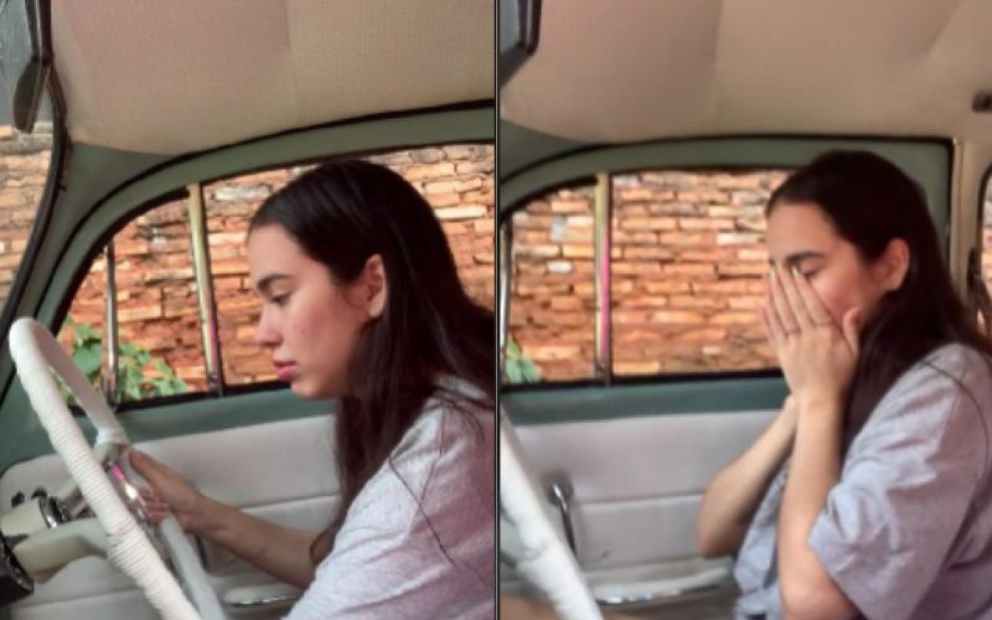 Luego, el hombre comenzó a repetir insistentemente las indicaciones. Confundida, la joven le hizo una pregunta a su padre: "¿Cómo se arranca?". Él le respondió: "Con la llave". Continuando con las indicaciones, le dijo: "Primera marcha, ahora suavecito". Sin embargo, una vez más, el motor se apagó.