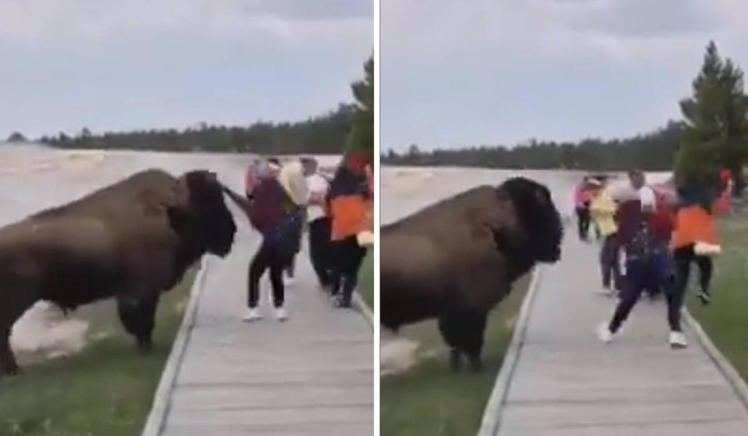 Un video de una mujer arrancando de un bisonte con el que se quería sacar una selfie se hizo viral en Internet.