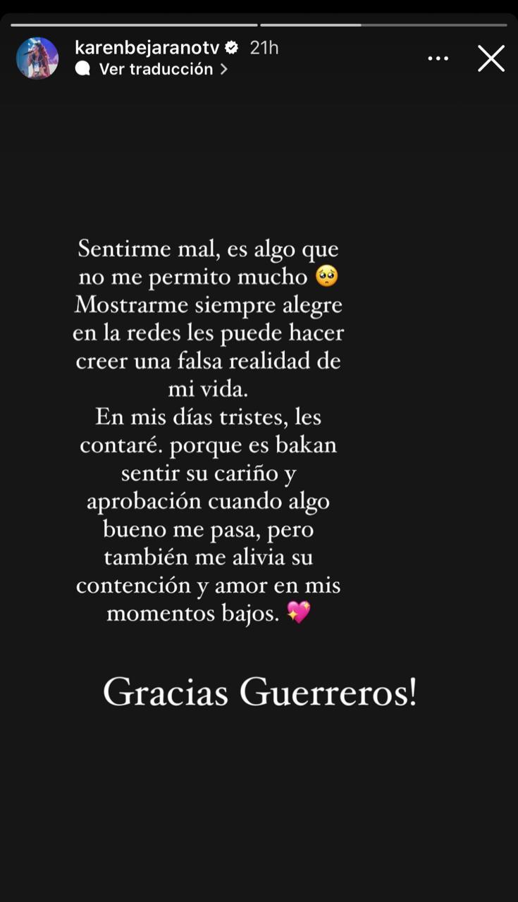 "En mis días tristes, les contaré. porque es bakan sentir su cariño y aprobación cuando algo bueno me pasa, pero también me alivia su contención y amor en mis momentos bajos. Gracias Guerreros!", cerró escribiendo Karen Bejarano.