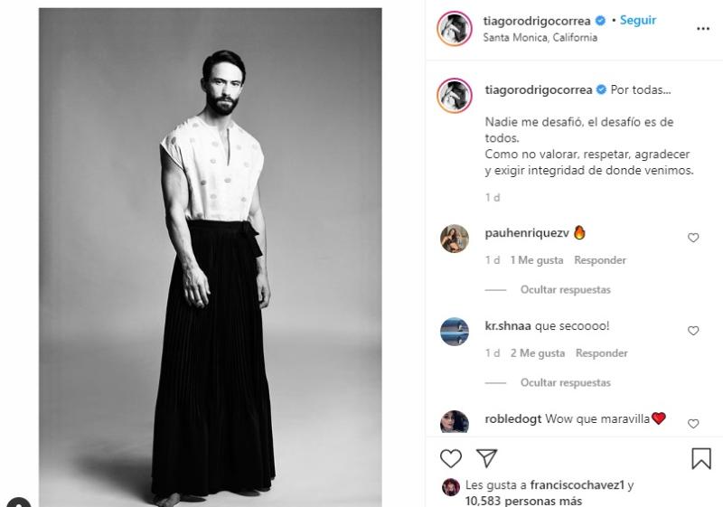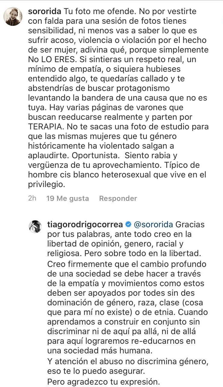 Sin embargo, la imagen generó controversia y una seguidora de Tiago decidió encararlo por su decisión de sumarse a un reto que no le correspondía. “Tu foto me ofende. No por vestirte con falda para una sesión de fotos tienes sensibilidad, ni menos vas a saber lo que es sufrir acoso, violencia o violación por el hecho de ser mujer, adivina qué, porque simplemente no LO ERES”, afirmó la usuaria @sororida.