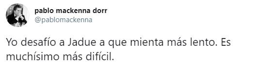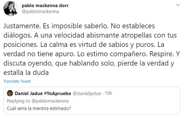 “¿Cuál será la mentira estimado?”, escribió Jadue, quien recibió una curiosa respuesta por parte del escritor. “Justamente. Es imposible saberlo. No estableces diálogos. A una velocidad abismante atropellas con tus posiciones. La calma es virtud de sabios y puros. La verdad no tiene apuro”, dijo Mackenna.