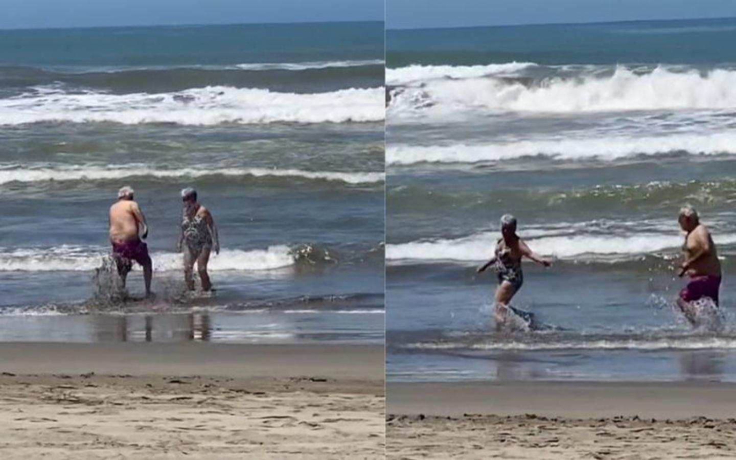 Pareja de adultos mayores jugando en la playa conmueve en redes