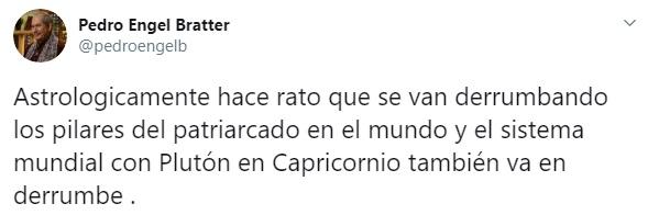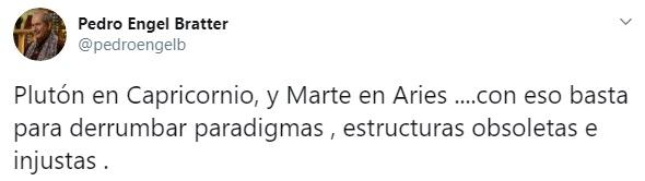A través de su cuenta oficial de Twitter (@pedroengelb), el tarotista y astrólogo escribió “Plutón en Capricornio, y Marte en Aries....con eso basta para derrumbar paradigmas, estructuras obsoletas e injustas”. Se trata de un mensaje que generó repercusión en la red social por el día en que se hizo.