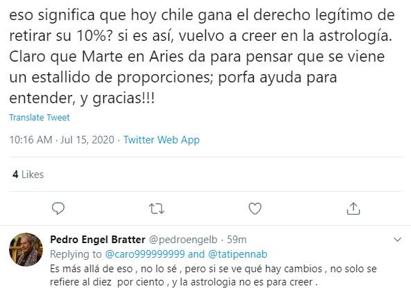 “¿Eso significa que hoy chile gana el derecho legítimo de retirar su 10%? si es así, vuelvo a creer en la astrología. Claro que Marte en Aries da para pensar que se viene un estallido de proporciones; porfa ayuda para entender, y gracias”, preguntó la usuaria @caro999999999.