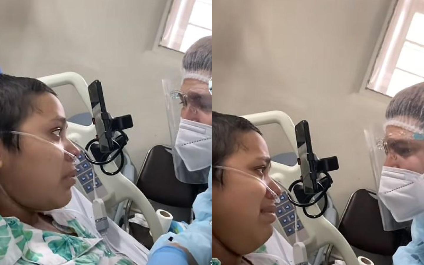 En las imágenes se ve a la joven recostada en una camilla de un hospital. Con mucha dificultad comienza a hablarle a su novio, quien aparece completamente equipado con indumentaria médica esterilizada.