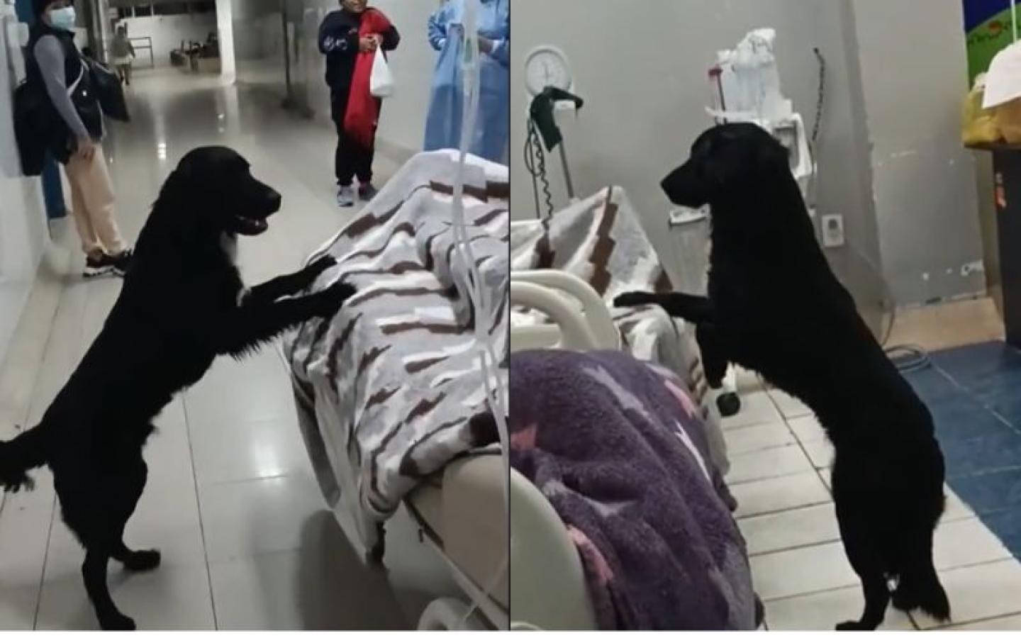 En las imágenes se ve como el can se para en la camilla para poder ver a su dueño, moviendo su colita. Posterior, se acuesta al lado de la camilla, haciéndole compañía a su dueño.
