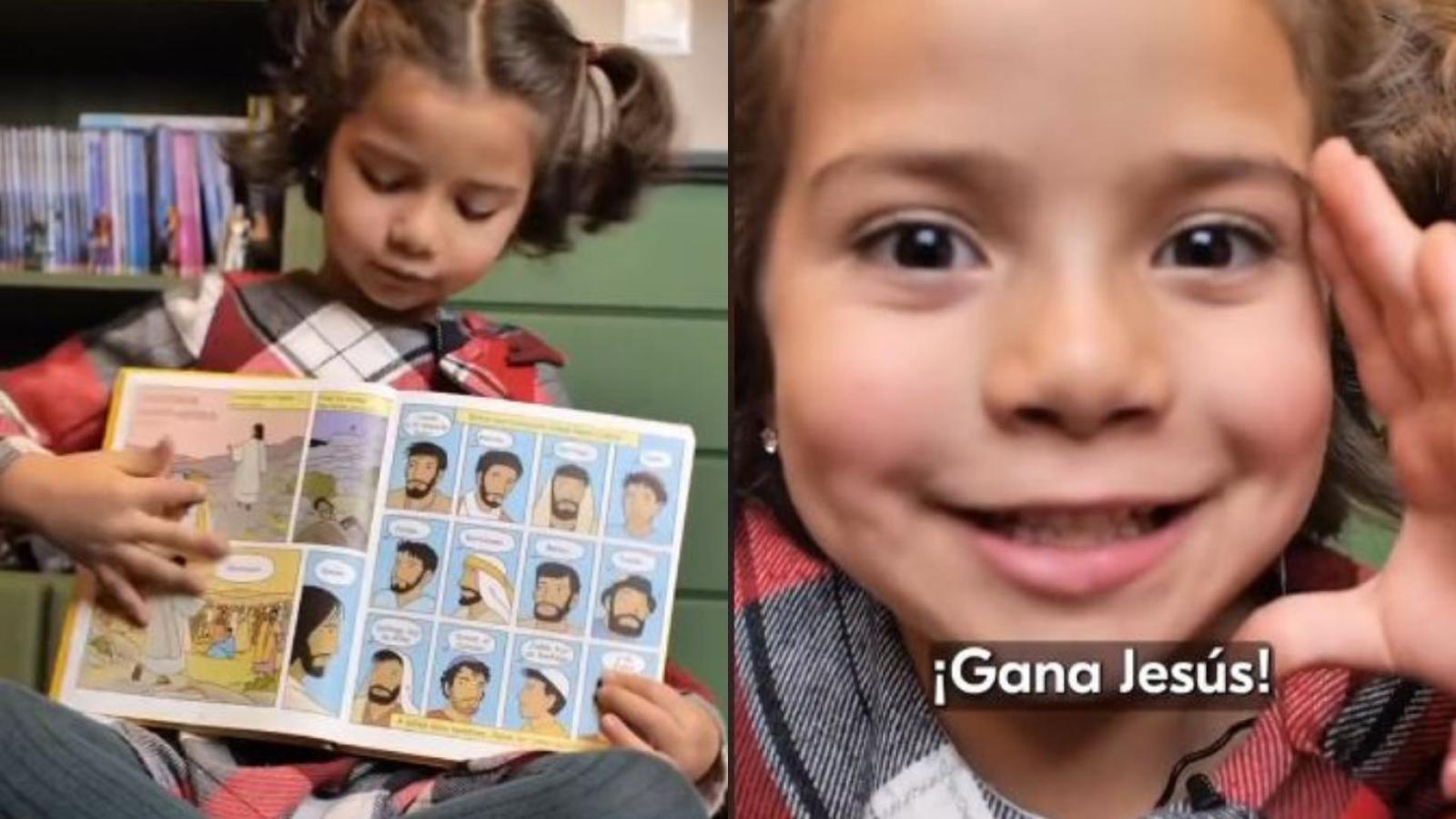 Con un “cómic” en la mano, la pequeña niña explica la peor batalla de Jesús que ocurrió en el desierto. “Se tuvo que enfrentar con el peor enemigo… ¿Doctor Octopus? ¿Magneto? No. El mismísimo diablo. ¡Spoiler! Gana Jesús”