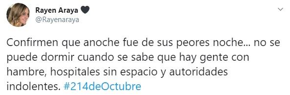 Todo comenzó con un tuit de la comunicadora, quien manifestó sus complicaciones personales a raíz del panorama que afecta a Chile. “Confirmen que anoche fue de sus peores noche... no se puede dormir cuando se sabe que hay gente con hambre, hospitales sin espacio y autoridades indolentes”, escribió.