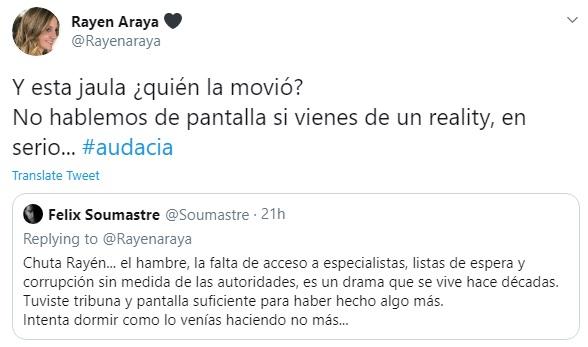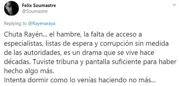 Araya recibió la respuesta del periodista, quien cuestionó su comentario, ya que parte de la población vive malos momentos hace años. “Chuta Rayén... el hambre, la falta de acceso a especialistas, listas de espera y corrupción sin medida de las autoridades, es un drama que se vive hace décadas. Tuviste tribuna y pantalla suficiente para haber hecho algo más. Intenta dormir como lo venías haciendo no más”, expresó.