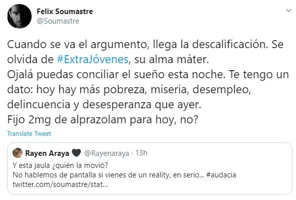 El tuit de Soumastre generó, a su vez, un curioso mensaje por parte de Araya. “Y esta jaula ¿quién la movió? No hablemos de pantalla si vienes de un reality, en serio”, escribió, haciendo alusión al paso de Félix por recordados programas de televisión como “Amor Ciego” y “Amor Ciego 2”, donde fue participante.