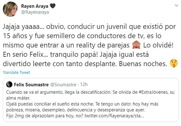 Rayén no se quedó “callada” y nuevamente se refirió al paso de Félix por los realities. “Yaaaa... obvio, conducir un juvenil que existió por 15 años y fue semillero de conductores de tv, es lo mismo que entrar a un reality de parejas. Lo olvidé! En serio Felix... tranquilo papá! Jajaja igual está divertido leerte con tanto desplante. Buenas noches”, manifestó, recordando una de las peleas que el también DJ tuvo con Edmundo Varas, ganador de “Amor Ciego”.