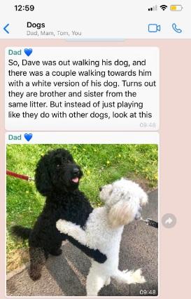 Dave, un amigo de la familia de Libby, sacó a pasear a su perro. En ese momento, se percató que una pareja hacía lo mismo con su propia mascota, una versión blanca de su can. Lo sorprendente fue que estos perros eran hermanos y no se veían desde que fueron separados al momento de su adopción.