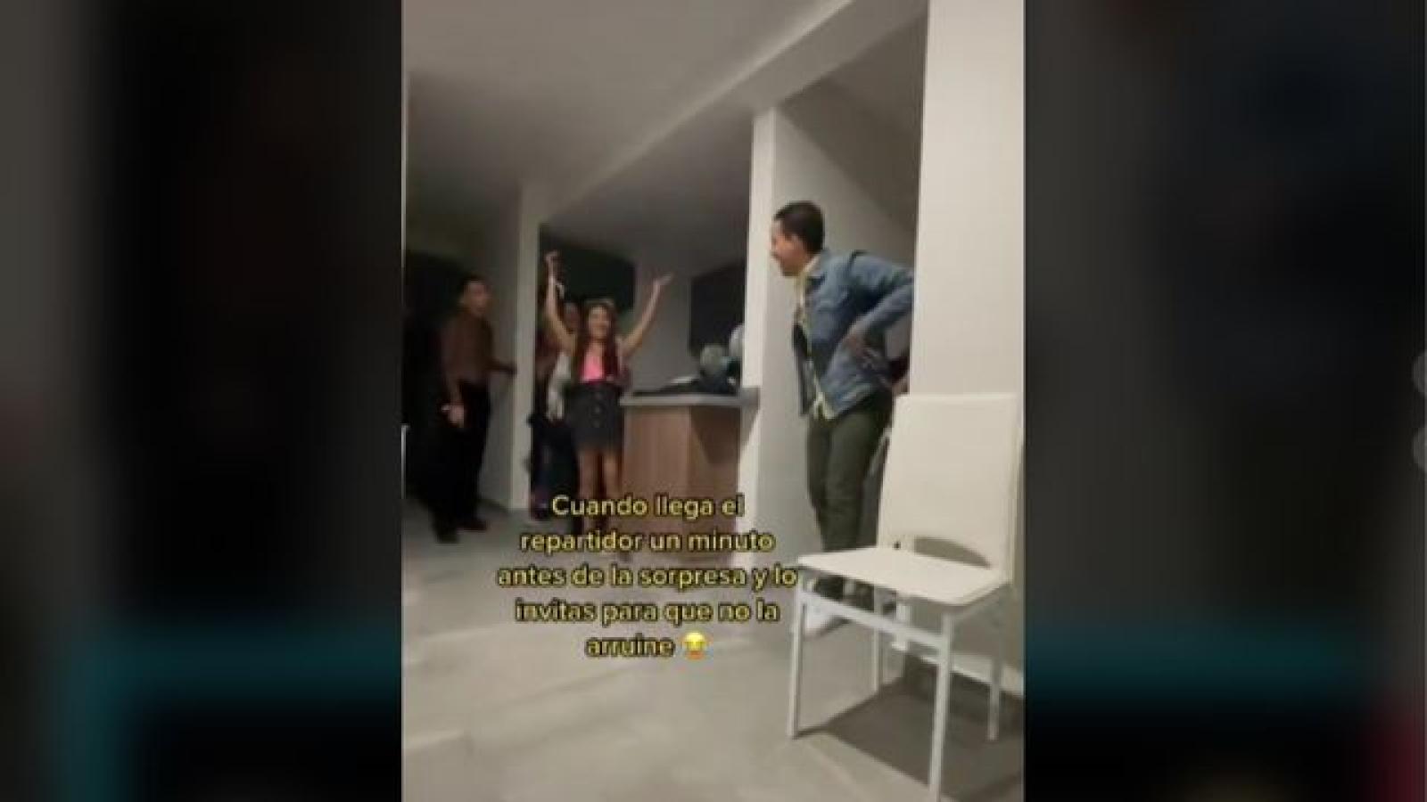 Un divertido video se ha vuelto viral en TikTok donde un repartidor de comida terminó sumándose inesperadamente a una fiesta sorpresa.