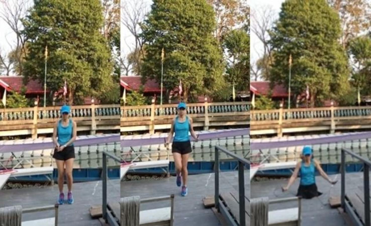 Una mujer que se encontraba haciendo ejercicio en un muelle de Tailandia sufrió un insólito accidente, luego de que cediera el piso del lugar donde saltaba la cuerda.