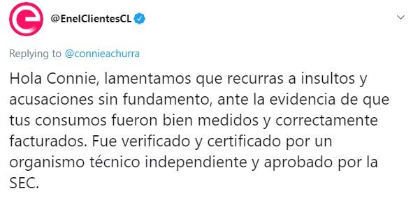 Enel, a través de la misma vía, le respondió. “Lamentamos que recurras a insultos y acusaciones sin fundamento, ante la evidencia de que tus consumos fueron bien medidos y correctamente facturados. Fue verificado y certificado por un organismo técnico independiente y aprobado por la SEC”, manifestó.