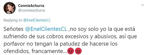 A través de su cuenta de Twitter (@connieachurra), la cocinera dio increpó a Enel, empresa que propociona el servicio de energía eléctrica, por los 337 mil pesos que debe pagar por su consumo en el último mes.