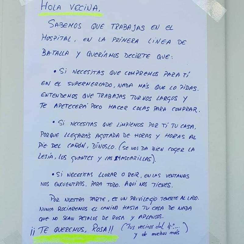 “Hola vecina, sabemos que trabajas en el hospital, en la primera línea de batalla, y queríamos decirte que: si necesitas que compremos para ti en el supermercado, nada más que lo pidas. Entendemos que trabajas turnos largos y te apetecerá poco hacer colas para comprar”, dice la nota.