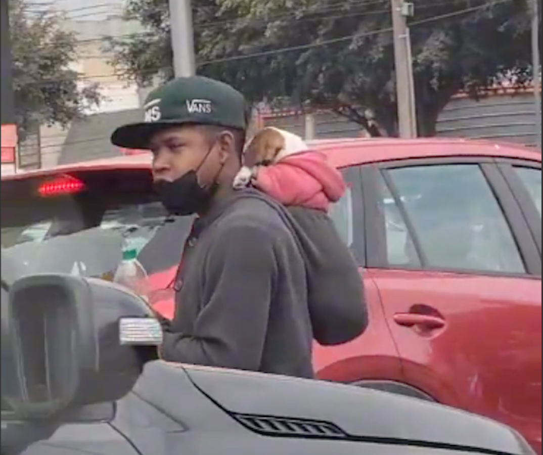Precisamente en el registro se puede apreciar a un hombre trabajando en un semáforo limpiando parabrisas, sin embargo, no lo hace solo, ya que está acompañado por su pequeño perro, a quien carga en un improvisado bolso en su espalda.