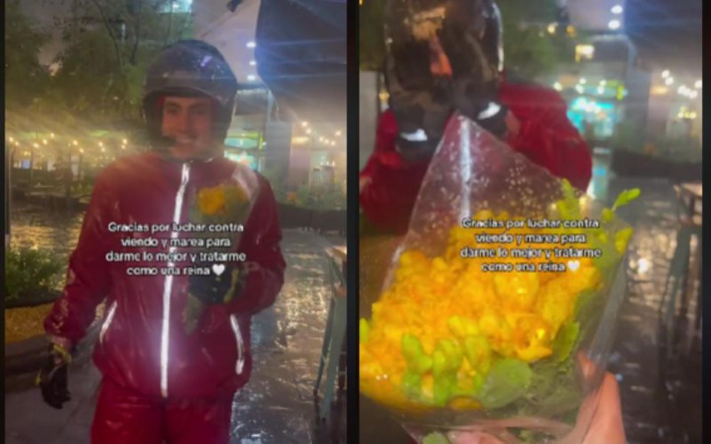 Concretamente, en las imágenes compartidas por una usuaria en TikTok se ve como un joven repartidor de delivery llega en su moto, en medio de la lluvia, a dejarle un ramo de flores amarillas a su novia.