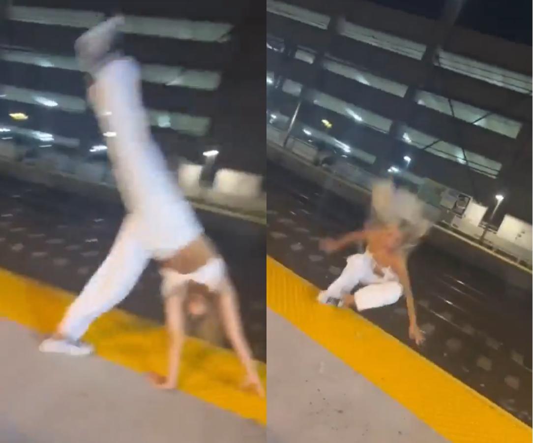 En el registro que se difundió a través de redes sociales, se puede apreciar cómo la mujer intentó realizar una rueda a la orilla del Metro. No obstante, en plena vuelta perdió el equilibrio y control de su cuerpo, cayendo de espaldas a las vías.