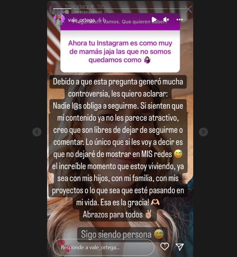 Si bien, la usuaria dijo el comentario en buenos términos, Vale Ortega aprovechó de aclarar en una historia de Instagram que tiene plena libertad para publicar lo que desee.
