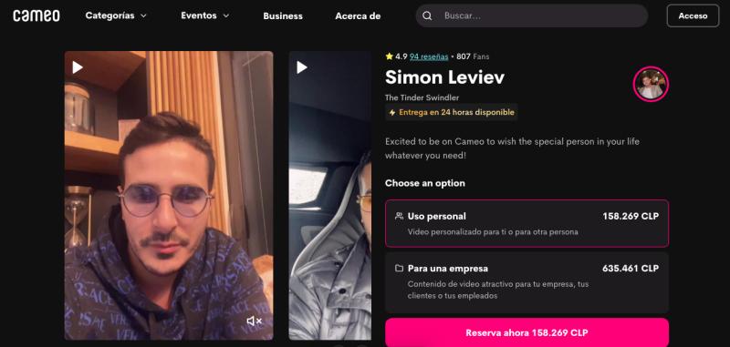 No obstante, Shimon Hayut (o Simon Leviev), abrió recientemente una cuenta en la app "Cameo", donde famosos pueden grabar videos o audios personalizados.